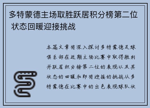 本篇文章将深入探讨多特蒙德足球俱乐部在近期主场比赛中取得胜利并跃居积分榜第二位的表现,以及其状态的回暖和即将迎接的挑战。从多特蒙德在比赛中的出色表现、球队状态回升的背景、主场优势的发挥,到即将面临的挑战等方面进行详细分析,全面揭示多特蒙德目前的竞争力及未来的发展趋势。文章通过四个方面的深入探讨,呈现出球队状态的逐步恢复与他们对未来目标的追求。1、主场胜利助力跃升积分榜第二多特蒙德近期的主场比赛表现...