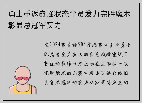 勇士重返巅峰状态全员发力完胜魔术彰显总冠军实力