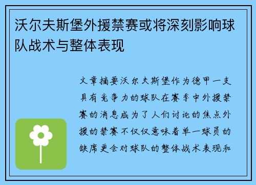 沃尔夫斯堡外援禁赛或将深刻影响球队战术与整体表现