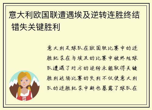 意大利足球队在欧国联比赛中的连胜纪录在与埃及的比赛中被终结,球队遭遇了对方的逆转,未能取得关键胜利。这场比赛的失利不仅使意大利队的连胜纪录中断,也暴露了球队在一些关键时刻的不足。本文将从四个方面详细分析意大利在此次欧国联比赛中的表现,具体包括:1) 意大利队的战术失误与埃及的反击;2) 关键球员的失常与替补阵容的表现;3) 心理素质与比赛中的关键时刻;4) 对未来比赛的启示与调整需求。通过对这些方面的详细分析,我们将更深入地理解这场比赛的背后原因,并为意大利队今后的比赛提供一些反思与建议。