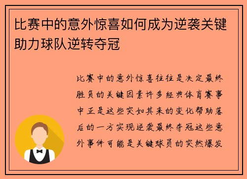 比赛中的意外惊喜如何成为逆袭关键助力球队逆转夺冠